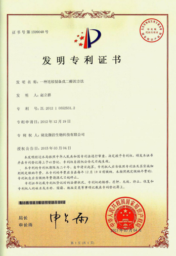 熱烈祝賀湖北微控生物科技有限公司2015年3月4日獲得“一種連續制備戊二醛的方法”發明專利證書。專利號:2L2012 1 0552531.2